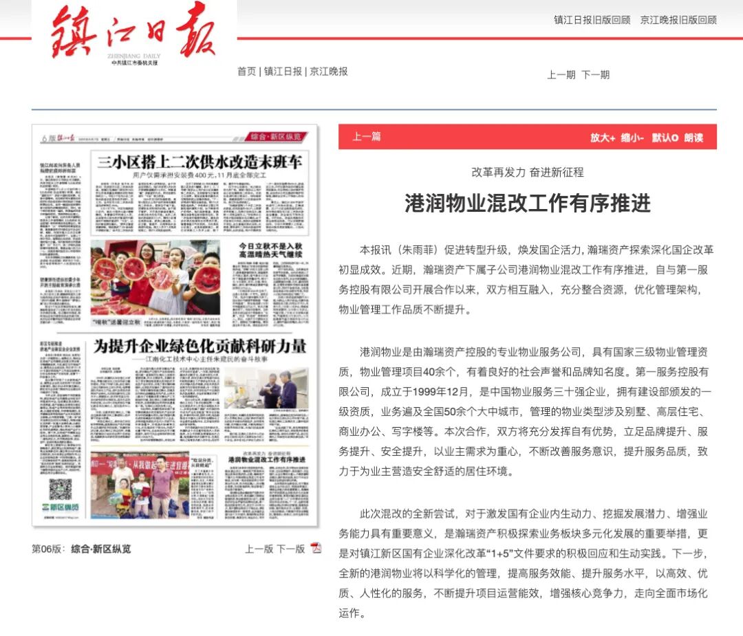 【镇江日报8月7日讯】促进转型升级,焕发国企活力, 瀚瑞资产探索深化国企改革初显成效。近期,瀚瑞资产下属子公司港润物业混改工作有序推进,自与第一服务控股有限公司开展合作以来,双方相互融入,充分整合资源,优化管理架构,物业管理工作品质不断提升。