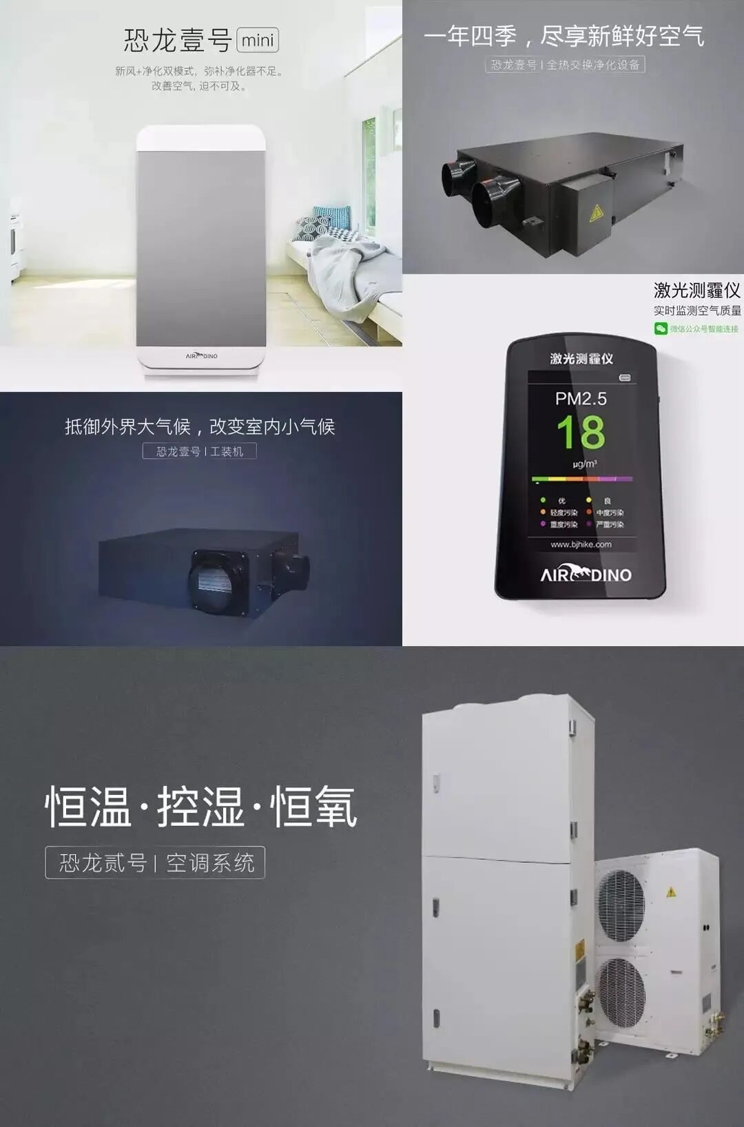 基于对中央温湿度独立控制系统的运营经验,对建筑健康体系的理解, 公司开发了自有专利的户式新风滤清系统恐龙壹号、户式温湿分控空调系统恐龙贰号,分室型新风滤清设备恐龙壹号(mini)3个产品系列,综合了新风、空调、空气净化、湿度调节等功能为一体,为不同地区的各类建筑提供室内舒适度问题的一站式解决方案。产品满足了改善型和刚需性建筑对室内健康环境的需求,从寒冷地区到夏热冬冷地区,一直到华南的夏热冬暖地区均有大量应用案例。