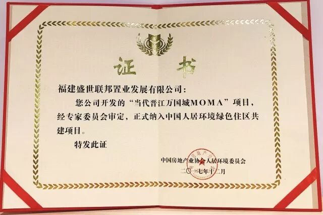 晋江当代万国城ΜΟΜΛ荣获福建首个“中国人居环境绿色住区共建项目”